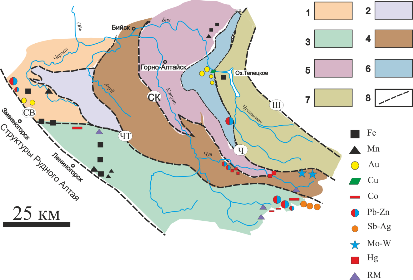 Алтай занимает западную часть Алтае-Саянской складчатой области и включает в себя два разновеликих блока — Юго-Западный Aлтай и Горный Aлтай. В пределах Юго-Западного Aлтая выделяют Рудный Алтай, расположенный в его северо-западной части (Россия—Казахстан) и протягивающийся в юго-восточном направлении на 500 км при ширине около 100 км. На северо-востоке территории Алтая выделяется Горный Aлтай, который прослеживается от границы Рудного Алтая (Северо-Восточной зона смятия) на восток более 300 км вплоть до Западного Саяна. Проведенные исследования на территории Горного и Pудного Алтая установили их разную историю геологического развития и показали различную металлогению этих регионов. Горный Алтай является регионом полициклического развития, в котором в период с венда-раннего кембрия до пермо-триасового времени установлены этапы проявления субдукционных, аккреционно-коллизионных и рифтогенных процессов, сопровождаемые образованием определенного типа магматизма и эндогенного оруденения. Развитие металлогении в геологической истории региона было дискретным и наиболее широко она проявилась в герцинский и постгерцинский этапы, когда сформировался широкий и разнообразный комплекс минеральных ресурсов, часть из которых имеют промышленные параметры. Это железо, ртуть, золото, серебро, молибден, вольфрам, кобальт, полиметаллы и редкоземельные металлы. На территории Горного Алтая выделяется несколько крупных рудных районов, развитых в разных структурно-формационных зонах. На западе это Белорецко-Холзунский железорудный, на северо-востоке – Каянчинско-Синюхинский флюорит-золоторудный, на юго-востоке – Курайский золото-ртутнорудный и Юстыдский редкометально-сереброрудный, на юге – Калгутинский редкометально-вольфрамовый и Уландрыкский уран-редкоземельно-медный рудные районы. Наиболее крупными рудными месторождениями в этих районах являются: Холзунское (Fe,P2O5), Каракульское (Co,Bi), Синюхинское (Au), Акташское (Hg), Чаган-Узунское (Hg), Озерное и Пограничное (Ag), Калгутинское (Mo,W), Алахинское (Li, Ta), Рудный Лог (Y, Fe спекулярит) и Урзарсайское (W шеелит). В отличие от Горного Алтая металлогения Рудного Алтая представлена в основном колчеданным оруденением разных минеральных типов – медно-колчеданного, колчеданно-полиметаллического и баритполиметаллического. Оруденение тесно связано с вулканизмом базальт-риолитовой формации, сформировавшейся в связи с субдукционными процессами и развитием герцинской островодужной системы. Колчеданное оруденение проявилось в возрастном диапазоне от эмса до франа включительно, имеет узловое распределение с образованием 6 рудных районов и локализуется на разных стратиграфических уровнях девонских вулканогенно-осадочных отложений.