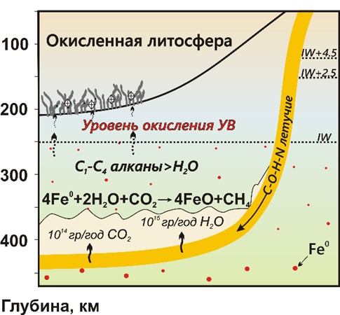 Экспериментально установлено, что углеводороды, преимущественно легкие алканы, стабильны при мантийных P-T параметрах как в упрощенной модельной C-O-H-N системе (Sokol et al., 2017a), так и в системе перидотит-флюид (Sokol et al., 2018a) в широком интервале редокс условий от ультра восстановленных до значений фугитивности кислорода, характерных для «водного максимума» (IW+2 лог. ед.). Карбоновые кислоты и другие кислородсодержащие УВ могут быть стабильны в преимущественно водно-азотно-углекислом флюиде даже в равновесии с карбонатсодержащим перидотитом. Углеводороды могут быть генерированы при мантийных Р-Т параметрах как за счет реакции водно-углекислого флюида с металлическим железом (Palyanov et al. 2012; Sokol et al., 2020a), так и за счет прямой гидрогенизации разных фаз углерода (графита, алмаза, аморфного углерода) водородсодержащим флюидом (Sokol et al., 2019a). Полученные результаты обеспечивают экспериментальное доказательство возможности неорганического образования углеводородов в восстановленных мантиях планет земной группы и Земле. Обосновано, что наиболее благоприятные условия для генерации углеводородов существуют в зонах взаимодействия субдукционных флюидов с металлсодержащей мантией.