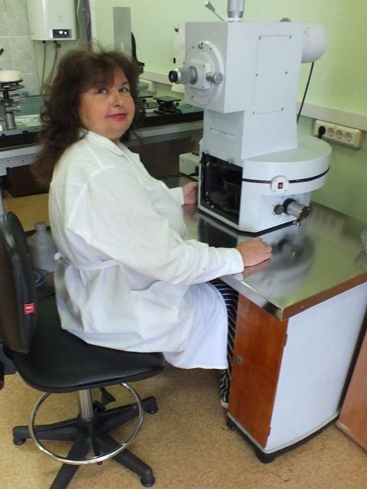 Финишная полировка на чистоту является очень сложным, тонким и трудоемким технологическим процессом, требующим высокого профессионализма. На фото снизу показан процесс полировки Шевердиной М.В. блока из кристалла ВВО.